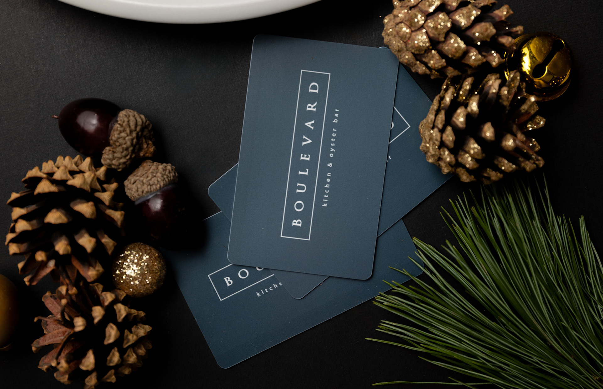 Gift cards can be purchased online and are valid for all dining experiences at Boulevard Kitchen & Oyster Bar.